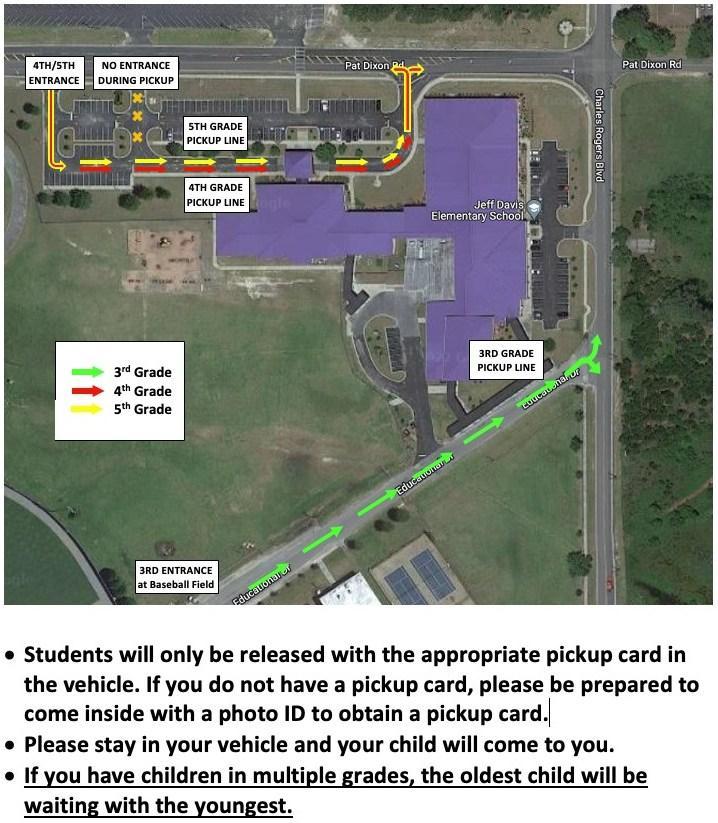 4th and 5th grade will be picked up in the front of the school with 5th grade in the left lane and 4th grade in the right lane. 3rd grade will be picked up behind the school in the bus lane prior to bus arrivals. If you have children in multiple grades, the oldest child will be waiting with the youngest child.